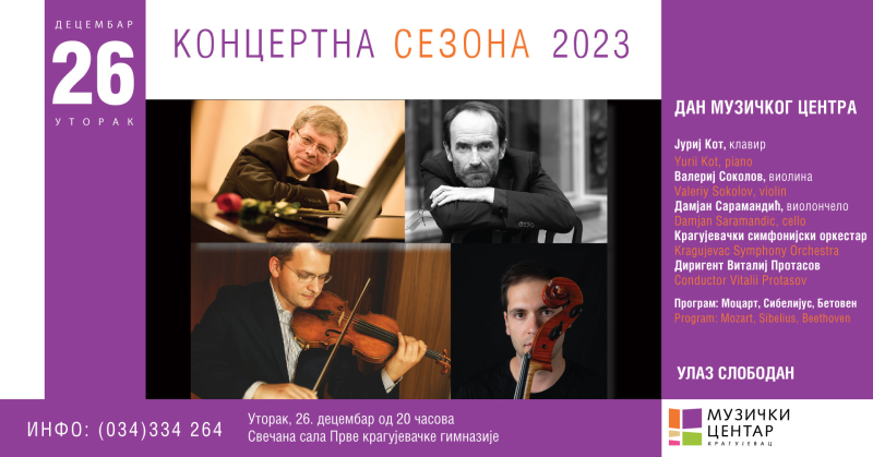 Музички центар Крагујевац, у оквиру концертне сезоне, а поводом Дана музичког центра, организује концерт Крагујевачког симфонијског оркестра, док ће солисти бити : Јуриј Кот, Валериј Соколов и Дамјан Сарамандић. Концерт ће бити у уторак у 20 часова у Првој крагујевачкој гимназији 26. децембра 2023. године под диригентском палицом Виталиј Протасова. На програму ће бити дела Моцарта, Сибелијуса и Бетовена.