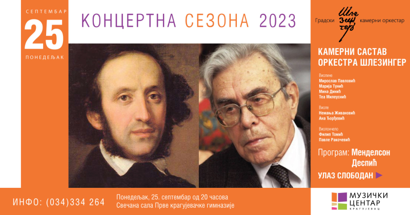 Музички центар Крагујевац, у оквиру концертне сезоне, организује концерт Градског камерног оркестра Шлезингер ( Октет ) у понедељак 25. септембра 2023. године у Свечаној сали Прве крагујевачке гимназије од 20 часова. Виолине ће свирати Мирослав Павловић, Марија Тунић, Мина Динић и Теа Милеуснић, виоле Немања Живановић и Ана Ђорђевић док ће виолончела свирати Филип Томић и Павле Ракочевић. На програму ће бити дела Менделсона и Деспића.