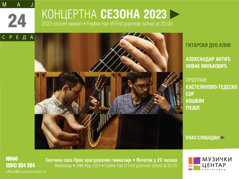 Музички центар Крагујевац, у оквиру Мајских свечаности, организује концерт Дуо гитара ”АLNO”. Гитарски дуо ”АLNO” је настао 2020. године као плод дугогодишње сарадње гитариста Александра Антића и Новака Миљковића. Дуо ”АLNO” представља класичну гитару у свом пуном сјају, одевену у рухо година пријатељства и заједничког музицирања. На програму ће бити дела Пуjола, Кошкина, Кастелнова-Тедеска и Сора.