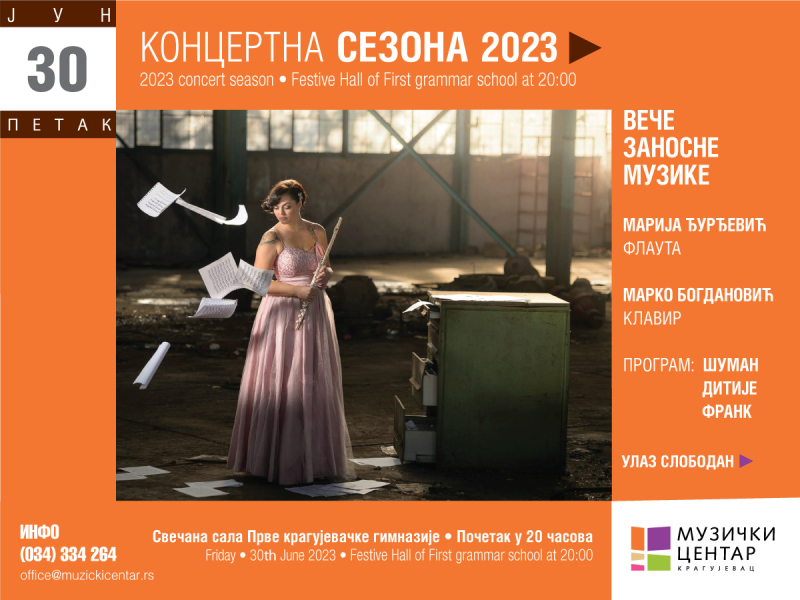 Музички центар Крагујевац, у оквиру концертне сезоне, организује концерт под називом " Вече заносне музике ", у петак 30. јуна 2023. године у 20 часова, у Свечаној сали Прве крагујевачке гимназије.