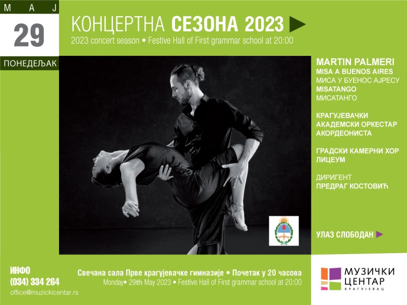 Музички центар Крагујевац, у оквиру Мајских свечаности, организује концерт Крагујевачког академског оркестра акордеониста и Градског камерног хора Лицеум. Концерт ће се одржати 29. маја 2023. године у Крагујевцу у 20 часова, под диригентском палицом Предрага Костовића. На програму ће бити Мартин Палмери “ MISATANGO ”. Солисти Петар Мирков (бандонеон) и Невена Милошевић (сопран) наступиће уз Крагујевачки академски оркестар акордеониста и Градски камерни хор Лицеум који је припремила проф. др Катарина Станковић, док ће целим ансамблом дириговати професор Предраг Костовић. Улаз слободан. Због ограниченог броја места, обавезна је резервација путем мејла