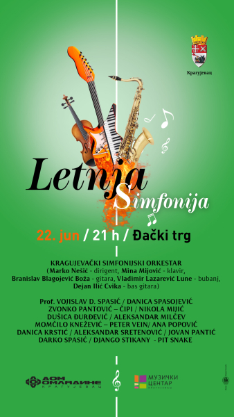 Музички центар Крагујевац, у оквиру концертне сезоне, организује концерт под називом “Летња симфонија“ у четвртак 22. Јуна 2023., године у 20 часова. На концерту ће учествовати Крагујевачки симфонијски оркестар са познатим уметницима града Крагујевца. Концерт ће се реализовати под диригентском палицом диригента Марка Нешића.