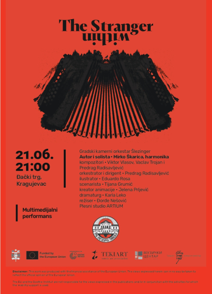 Музички центар Крагујевац поводом Светског дана музике, организује мултимедијални пројекат Stranger Within, аутора Мирка Шкарице и у режији Карле Леко. Музика за соло хармонику и камерни оркестар, заједно са анимацијом, нарацијом, савременим плесом и светлом, износи потресну причу о борби човека са властитом тамом.