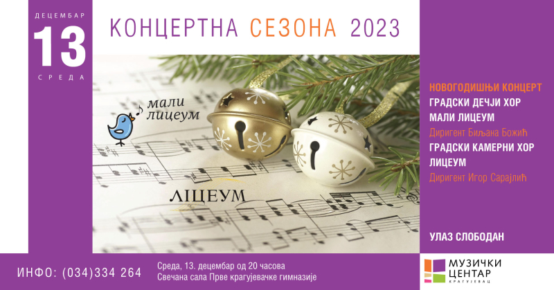 Музички центар Крагујевац, у оквиру концертне сезоне организује “Новогодишњи концерт“ Градског дечијег хора Мали Лицеум и Градског камерног хора Лицеум у среду 13. децембра 2023. године у Првој крагујевачкој гимназији у 20 часова. Концерт ће се реализовати под диригентском палицом Биљане Божић и Игора Сарајлића.