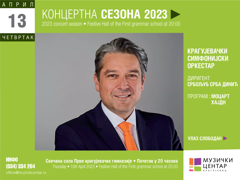Музички центар Крагујевац, у оквиру концертне сезоне, организује концерт Крагујевачког симфонијског оркестра под диригентском палицом Србољуба Србе Динића. Концерт ће бити у четвртак 13. априла 2023. године у 20 часова у Свечаној сали Прве крагујевачке гимназије у Крагујевцу.