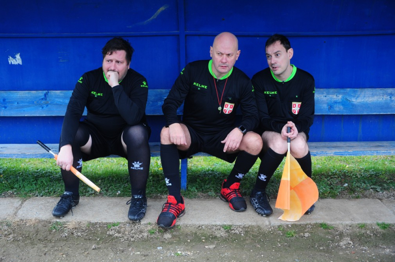 Позоришни комад „Блитва и кромпир“ мађарског писца Золтана Егрешија, изузетно је игран и популаран комад последње деценије у многим позориштима Источне Европе. Савремена трагикомедија о тројици пријатеља заправо је прича о два губитника који ће покушати да узурпирају планове свог успешнијег колеге, што из зависти, што у циљу преотимања вољене жене. Иза ове духовите и животне приче крију се многи неуспеси савременог доба, и животни и пословни: изгубљене љубави, уништени снови о срећи, немоћ да преузмемо живот у своје руке, слабост да превазиђемо препреке које су нас сломиле. Три главна јунака, Сапун, Уметник и Лаки, у улогама фудбалских судија неке од нижих лига нашег бедног фудбала, показаће нам како се заправо у сваком од њих, као у неком огледалу, можемо повремено препознати. На крају нема хепиенда ни за једног од ликова, али нема ни велике поруке – осим да живот прихватимо онаквим какав је и повремено поразговарамо сами са собом, можда проблем није увек изван нас.